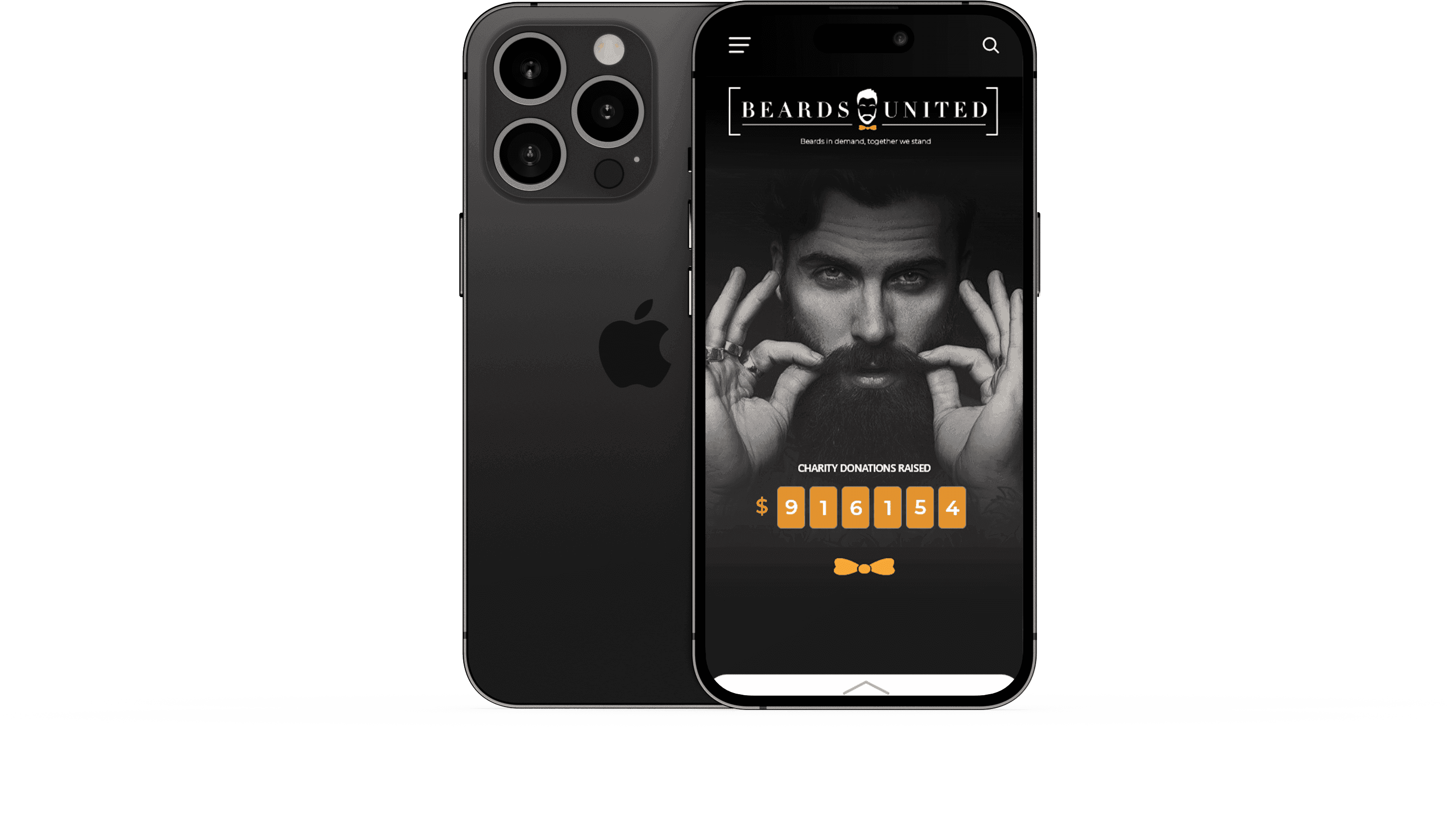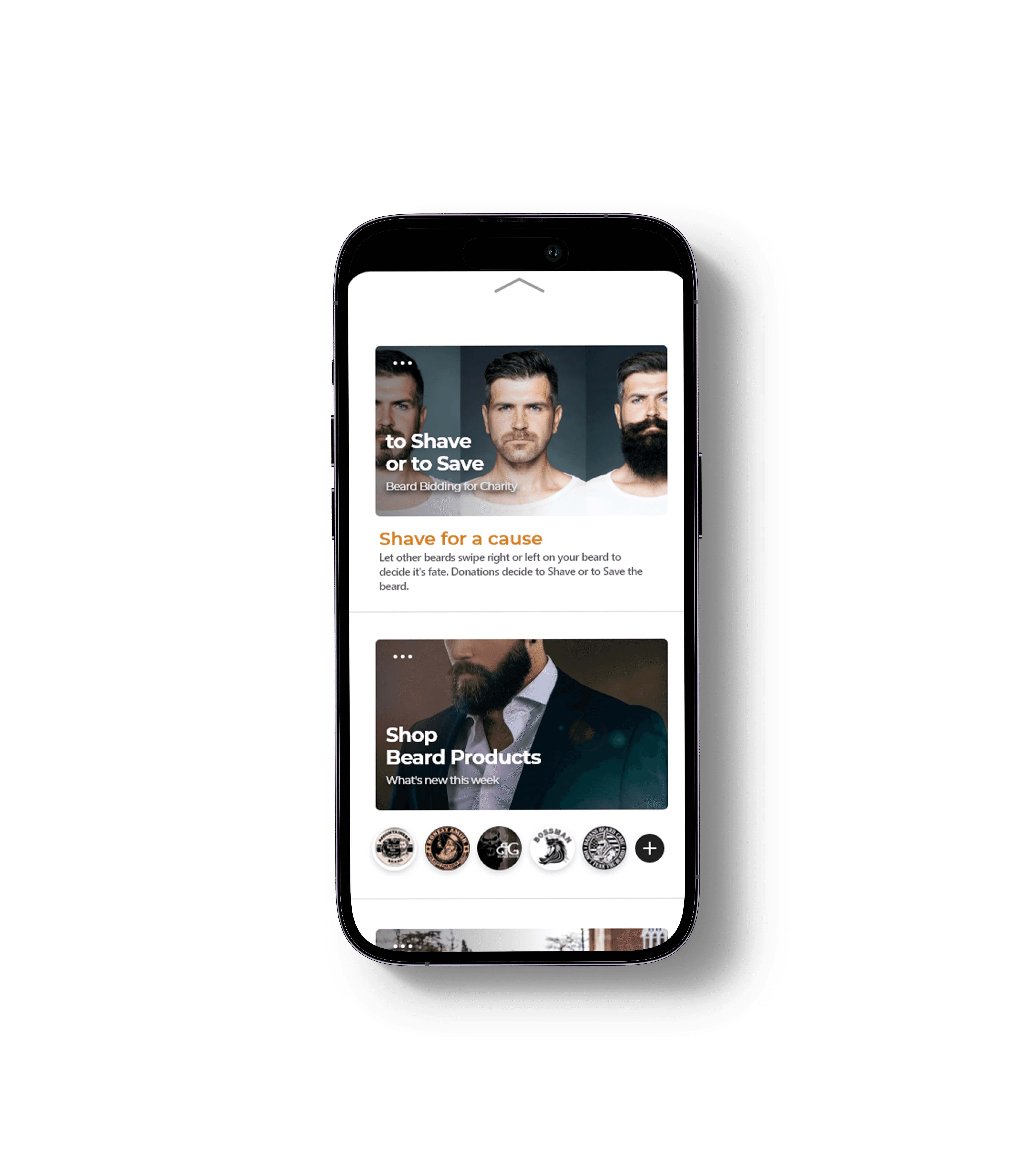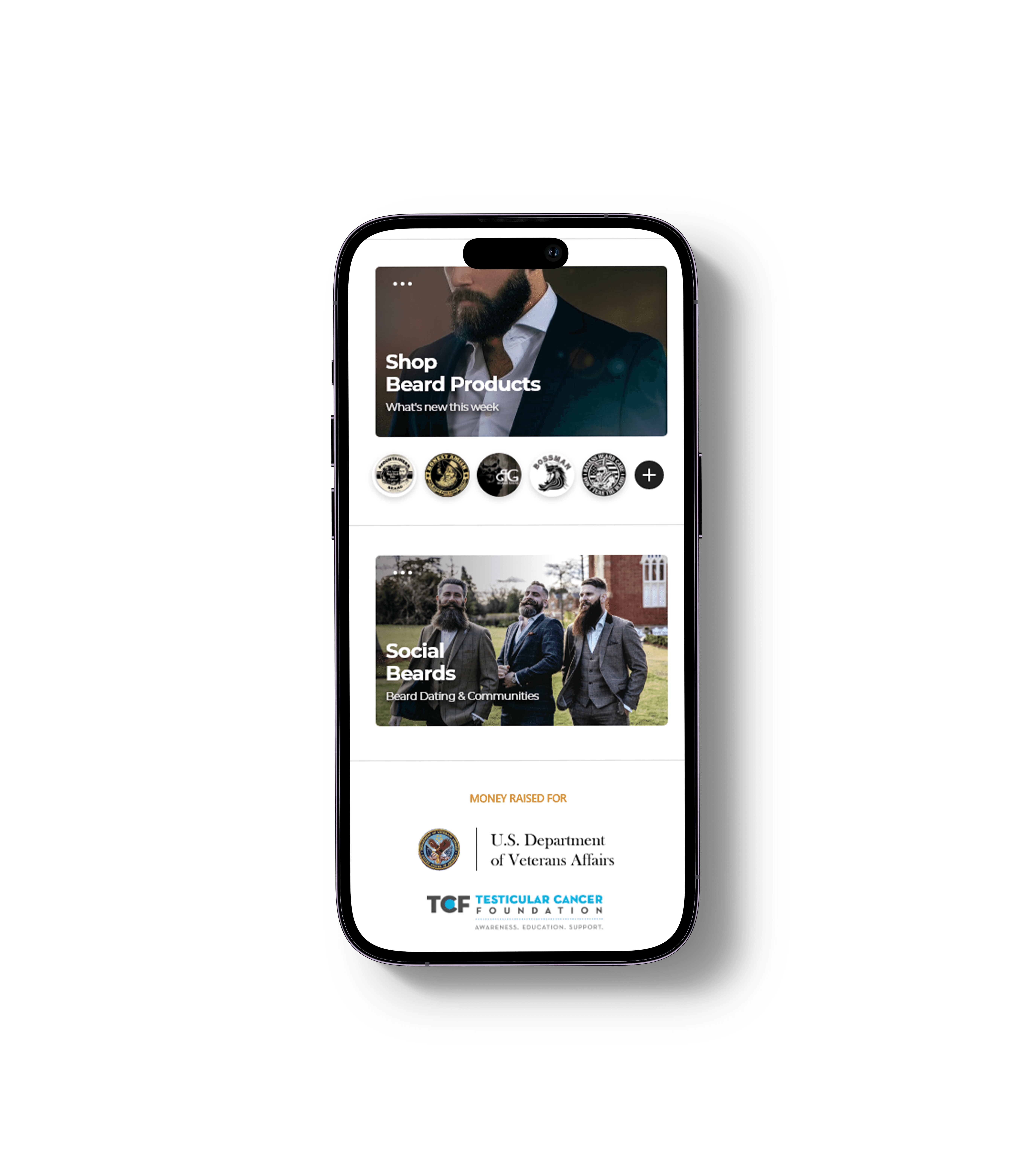Features the current bidding amount raised for charities through the platform. Scrolling reveals quick links to other features like beard bidding competitions, access to your favorite beard products, and blog posts of upcoming beard events.
