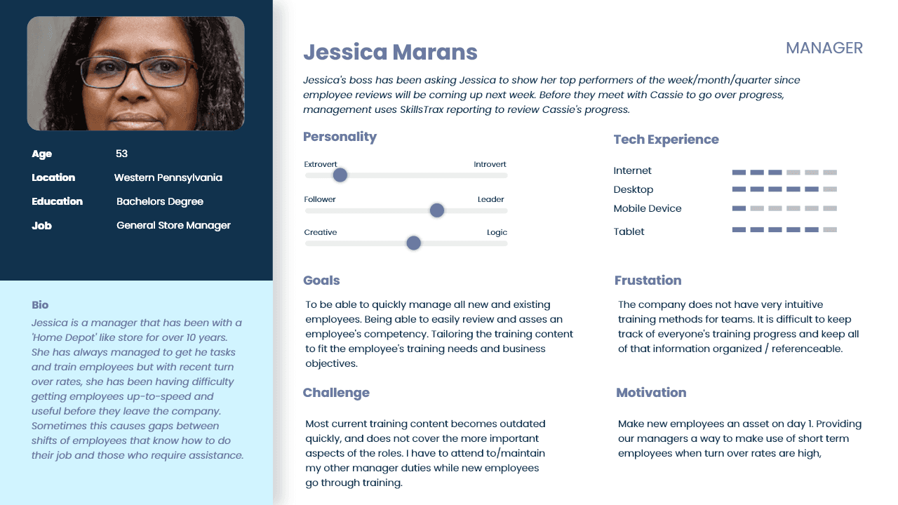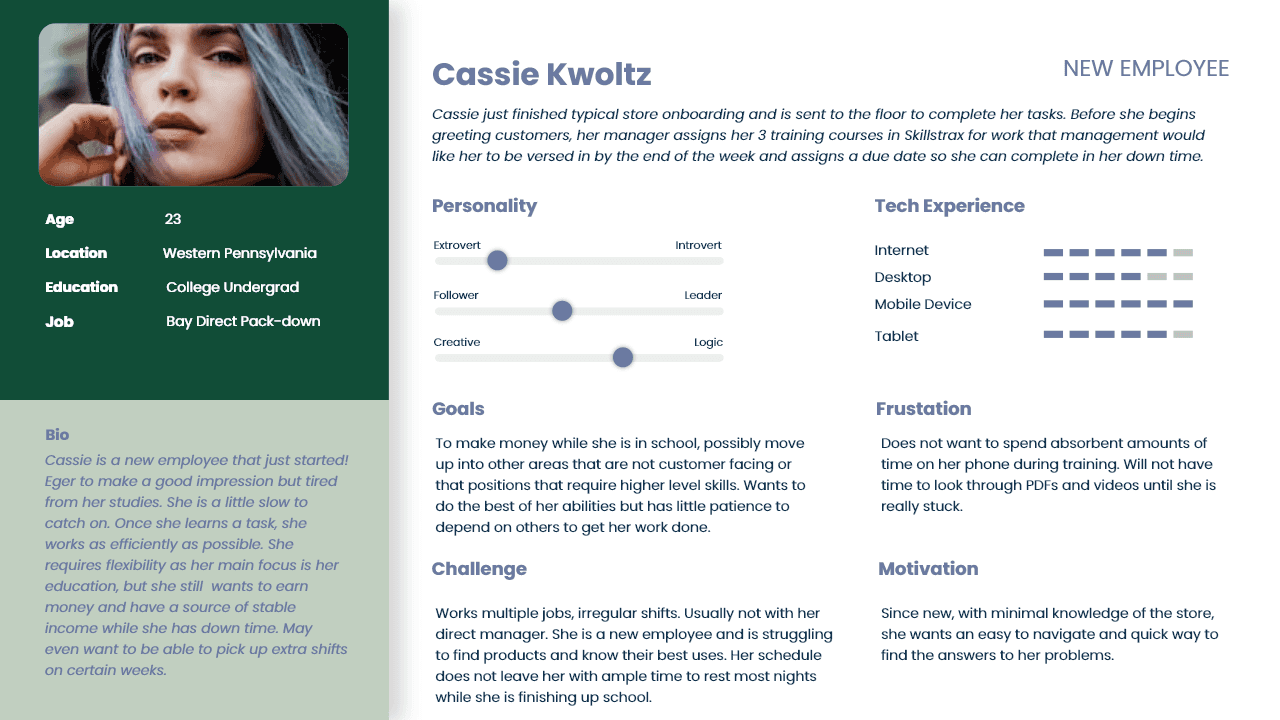 The goal was to create an intuitive platform that would increase engagement in new employees, streamline the training process, and connect learning directly to career advancement. SkillsTrax approached me to design their corporate training platform that focused on supporting clients that suffer from:
